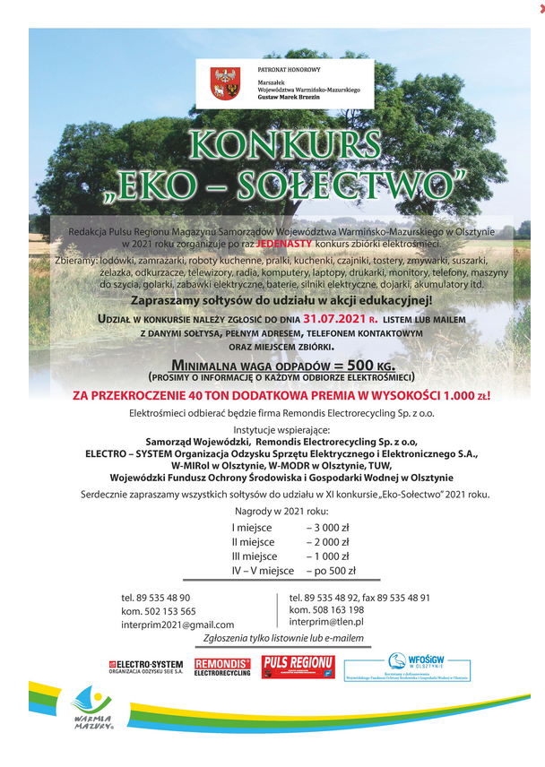 Zapraszamy sołtysów oraz społeczność sołectw do udziału w XI edycji konkursu EKO-SOŁECTWO organizowanego przez Redakcję Pulsu Regionu Magazynu Samorządów Województwa Warmińsko- Mazurskiego w Olsztynie.