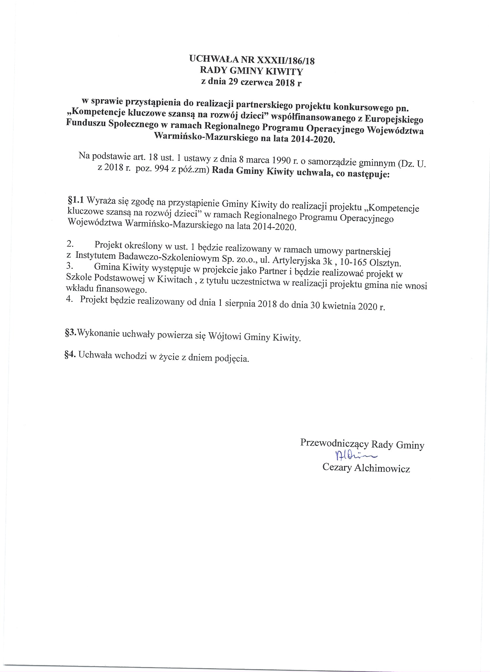 Uchwała w sprawie przystąpienia do realizacji partnerskiego projektu "Kompetencje kluczowe szansą na rozwój dzieci".