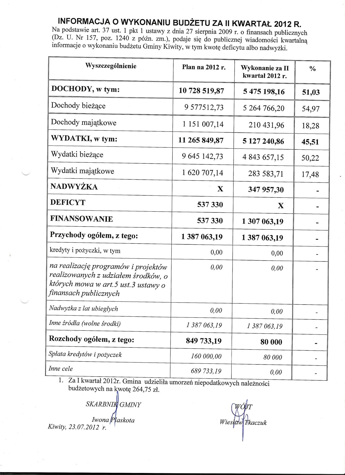 Informacja o przebiegu wykonania budżetu gminy Kiwity, wykonania planu finansowego gminnej instytucji kultury oraz informacji o kształtowaniu się wieloletniej prognozy finansowej za I półrocze 2012 roku.